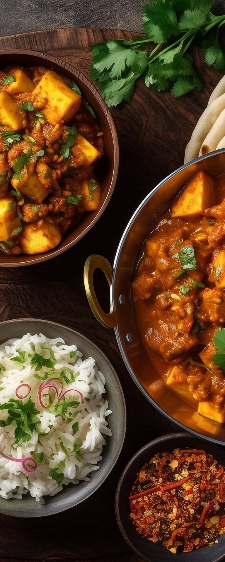 Lentils cooked with fresh spinach and mild spices, creating a wholesome, comforting curry. Crumbled paneer sautéed with onions, tomatoes, and aromatic spices for a rich, savory dish.